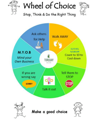 If students are faced with a problem, they can use the Wheel of Choice to choose good strategies to use to respond. This is taught to students and posted in areas around the school grounds.